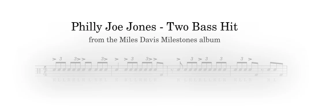 Philly Joe Jones' iconic uptempo solo on Two Bass Hit, off of the Milestones album from Miles Davis. Lots of classic Philly Joe Jones vocabulary. Snare-focused phrasing, bouncy conversation between the snare and bass drum, classic Philly Joe Jones-isms (like the "RLL RLR RLL" triplet sticking for groups of 9), and interesting textures (stick shots and buzz presses). A great solo to learn for bebop vocabulary!