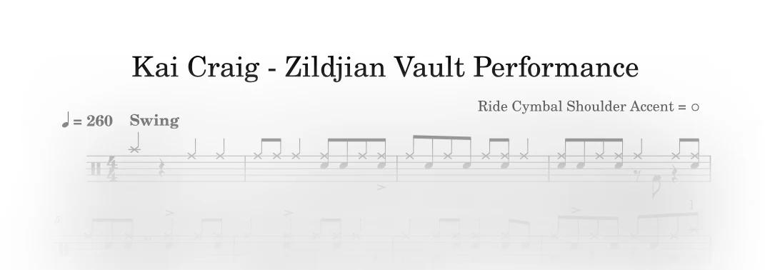 Modern, complex, uptempo broken-time comping work from Kai Craig. There's lots of 3/4 over 4/4 in the ride cymbal pattern variation, and some interesting 3 over 4 subdivisions around the toms on the kit. Came across this video on Instagram and had to transcribe and learn it - give it a listen!